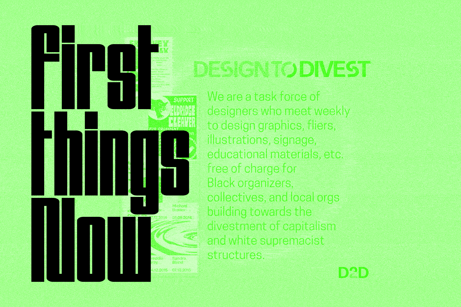 Design to Divest is a Black-led collective of designers, artists, technologists, and strategists focused on creating a more just society through divesting from inequitable systems and institutions, and designing new ones where Black and other marginalized people have true equity and ownership. In addition to providing complimentary graphic design services for Black cause-based organizations, the collective strives to shift power structures by making design education accessible, cultivating a new vanguard of Black creative thought leaders, and supporting Black designers and their work.